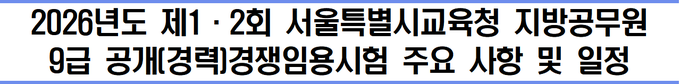 서울특별시교육청(교육감 정근식)은 3월 3일 공고를 통해 「2026년도 제1·2회 서울특별시교육청 지방공무원 9급 공개(경력)경쟁임용시험」 시행계획을 발표했다.