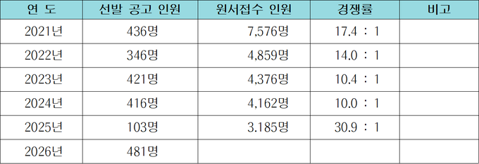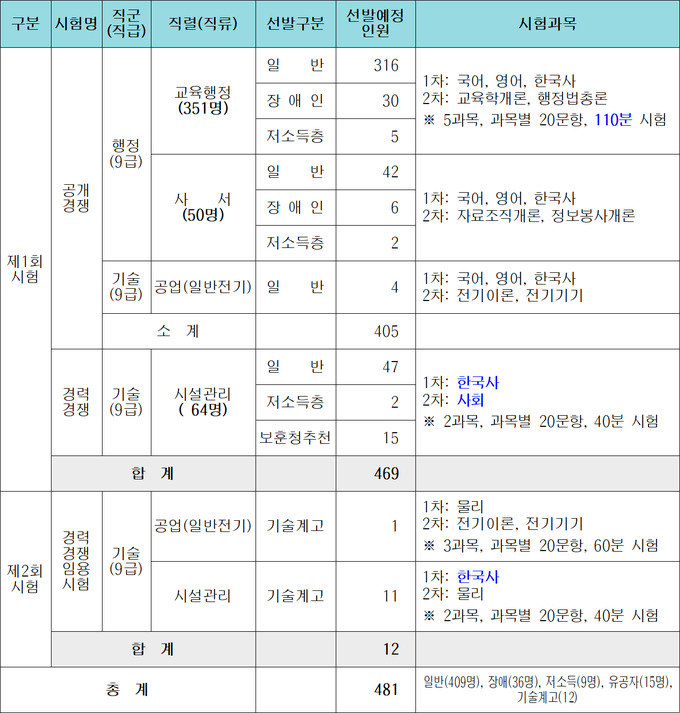 올해 신규 공무원 채용인원은 공개경쟁 405명, 경력경쟁 76명으로 총 481명이다. 분야별로 행정직군 401명(교육행정 351명, 사서 50명), 기술직군 80명(공업 5명, 시설관리 75명)이다.