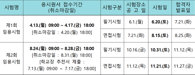 제1회 공개경쟁 및 경력경쟁 임용시험(469명) 응시원서는 4월 13일(월)부터 4월 17일(금)까지 온라인교직원채용사이트(https://edurecruit.go.kr) 에서 접수할 예정이며, 필기시험은 6월 20일(토) 시행 후 7월 21일(화) 합격자를 발표할 예정이다.