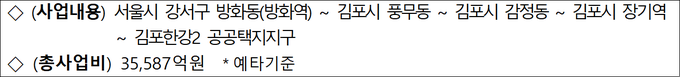 한편, 서울5호선 김포검단연장은 서울 방화차량기지를 기점으로 김포고촌·풍무·검단을 경유해 김포한강2 공공택지지구까지 연장하는 사업이다. 총 연장 25.8km에 정거장 9개소, 차량기지 1개소가 설치되며, 총사업비는 3조 5,587억원 규모다.