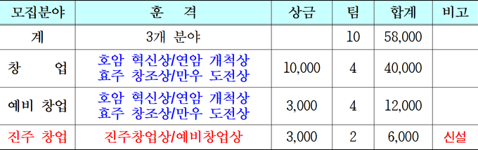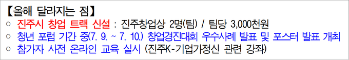 또한 7월 9일부터 10일까지 개최되는 ‘진주 K-기업가정신 청년 포럼’ 기간 중 창업경진대회 우수사례 발표를 확대 개최하고, 참가팀의 아이디어와 성과를 공유하는 포스터 발표도 함께 진행해 창업가 간의 교류와 학습의 장을 더욱 넓힐 것으로 기대된다.