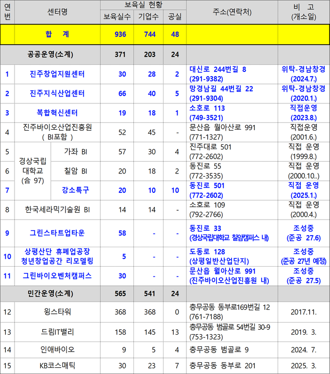 - 진주창업지원센터, 진주지식산업센터, 복합혁신센터, 강소특구, 그린스타트업타운,