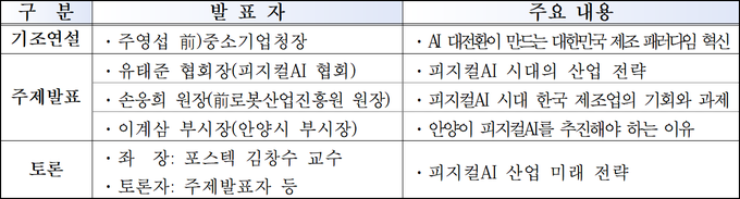 이어 진행된 주제발표에서 손웅희 전 한국로봇산업진흥원 원장, 유태준 한국피지컬AI협회장(마음AI 대표), 이계삼 안양시 부시장은 피지컬 AI 시대를 맞아 한국 제조업의 기회와 산업 전략, 그리고 안양의 역할과 가능성에 대해 발표했다.