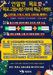 목포시는 본격적인 연말정산 준비 시기를 맞아 올해 마지막으로 ‘연말엔 목포愛~ 고향사랑기부제 특급 이벤트’를 진행한다고 밝혔다.이번 이벤트는 고향사랑기부제를 통해 목포시에 10만 원 이상 기부하고 답례품을 신청한 기부자를 대상으로 하며, 별도의 응모 절차 없이 자동으로 참여된다. 이벤트는 11월 5일부터 12월 21일까지 진행되며, 총 810명에게 경품이 제공된다.먼저 선착순 700명에게는 네이버페이 포인트 쿠폰 5천 원 권이 지급되고, 이후 추첨을 통해 100명에게는 1만 원 권, 10명에게는 5만 원 권을 추가로 증정한다. 다만, 보다 많은 기부자에게 혜택을 제공하기 위해 경품은 중복 지급되지 않으며, 당첨 시 최상위 경품만 지급된다. 예를 들어, 선착순 700명 안에 들면서 동시에 추첨을 통해 5만 원 권에 당첨된 경우, 5만 원 권만 지급되고 선착순 명단에서는 제외된다.이번 경품으로 제공되는 네이버페이 포인트 쿠폰은 간편하고 즉시 사용 가능한 디지털 경품으로, 기부자들이 실질적인 혜택을 체감할 수 있도록 마련됐다. 10만 원 기부 시 전액 세액공제와 3만 원 상당 답례품, 여기에 최대 5만 원 네이버페이 포인트 쿠폰까지 받을 수 있어 총 18만 원 규