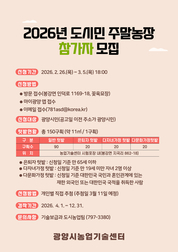 광양시는 도심 속에서 농업을 체험하며 가족과 함께 건강한 여가를 보낼 수 있는 ‘2026년 도시민 주말농장’ 참가자를 2월 26일부터 3월 5일까지 모집한다고 밝혔다. 도시민 주말농장은 시민이 일정 구획의 텃밭을 분양받아 직접 작물을 재배하는 체험형 농업 프로그램으로, 농업에 대한 이해를 높이고 건강한 먹거리의 가치를 체험할 수 있도록 매년 운영되고 있다. 신청 대상은 공고일 이전 주민등록상 주소지가 광양시인 시민이며, 참가비는 1만 원이다. 올해는 ▲일반텃밭 90구획 ▲은퇴자텃밭 20구획 ▲다자녀가정 텃밭 20구획 ▲다문화가정 텃밭 20구획 등 총 150구획을 운영한다. 대상자 선정은 신청 서류 검토를 통과한 시민에 대해 개인별 직접 추첨 방식으로 진행된다. 주말농장은 4월부터 12월까지 운영될 예정이며, 농업기술센터에서 퇴비 및 비료 시용, 경운, 구획 정리 등 텃밭 기반을 사전에 조성한다. 선정된 참가자는 모종과 종자, 소형 농기구 등을 직접 준비해 자율적으로 텃밭을 가꾸게 된다. 도시민 주말농장 신청은 광양시 농업기술센터 방문, ‘MY광양’ 앱 또는 전자메일을 통해 가능하며, 기타 자세한 사항은 광양시청 누리집 공고를 참고하거나 기술보급과(☎061-7