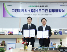 고양특례시(시장 이동환)는 지난 21일(금) ㈜네토그린과 ‘스마트농업 확대·육성을 위한 업무협약(MOU)’을 체결했다고 밝혔다. 이번 협약은 고양시가 추진해 온 스마트농업 정책과 민간기업의 혁신 역량을 연결해 고양시의 미래농업 경쟁력을 강화하는 중요한 계기가 될 전망이다. 협약에서 양 기관은 △ 스마트농업 기반 조성 △ 행정·제도적 협력 △ 스마트팜 실증 및 민간주도형 모델 확산 △ 지역 농업인·기업과의 상생협력 강화 등에 대해 상호 협력하기로 뜻을 모았다. 스마트팜 기업 ㈜네토그린은 고양시 지식산업센터에서 수직형 스마트팜 2개소를 운영 중이며, 2025년 10개소, 2026년 50개소까지 단계적으로 확대할 계획이다. 과채류 중심의 대규모 스마트팜 실증시설과 생산·유통 기지 구축도 계획하고 있다. 이를 통해 시는 도심 내 스마트농업 실증공간을 지속적으로 확보하고, 스마트농업의 중요한 거점으로 성장할 수 있는 기반을 마련할 수 있을 것으로 기대된다. 이동환 시장은 “네토그린이 고양시를 미래 농업의 핵심 거점으로 선택해 주신 데 깊이 감사드린다”며“시는 이번 협약이 실질적인 성과로 이어지도록 행정적·제도적인 지원을 아끼지 않겠다”라고 말했다. 시는 앞으로도 민간