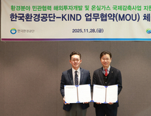 기후에너지환경부 산하 한국환경공단(이사장 임상준)은 11월 28일 서울시 여의도 소재 한국해외인프라도시개발지원공사(KIND) 대회의실에서 KIND와 ΄환경분야 민관협력 해외투자개발 및 온실가스 국제감축 지원 등΄을 위한 업무협약을 체결했다. 이번 협약은 2020년에 체결한 기존 업무협약을 확대하여 공동 해외 환경시장 개척과 민관 합동 수주지원을 확대하기 위해 추진되었다. 양기관은 ▲ 국제기구·국제개발은행(MDBs) 활용 해외 민간투자사업(PPP) 사업 ▲ 온실가스 국제감축사업 ▲ 해외 환경인프라 구축, 시장 개척, 민관 합동 수주 및 해외 네트워크를 활용한 사업 발굴 등의 분야에서 상호 협력을 강화한다. 한국환경공단은 2011년부터 국제협력과 해외사업을 전담하는 부서를 운영하고 있다. 2022년에는 기후에너지환경부 국제환경협력센터로 지정되어 기후·대기, 하수도, 자원순환 등 환경 전반분야에서 그린ODA를 수행하고 있다. 공단은 현재 몽골 등 4개국 5건의 그린ODA를 수행 중이며, 2026년부터 라오스 등 3개국 3건의 사업을 추가로 수행할 예정이다. 임상준 한국환경공단 이사장은 “이번 협약은 양 기관이 갖고 있는 강점을 활용해 해외시장 개척과 민관 합동 수